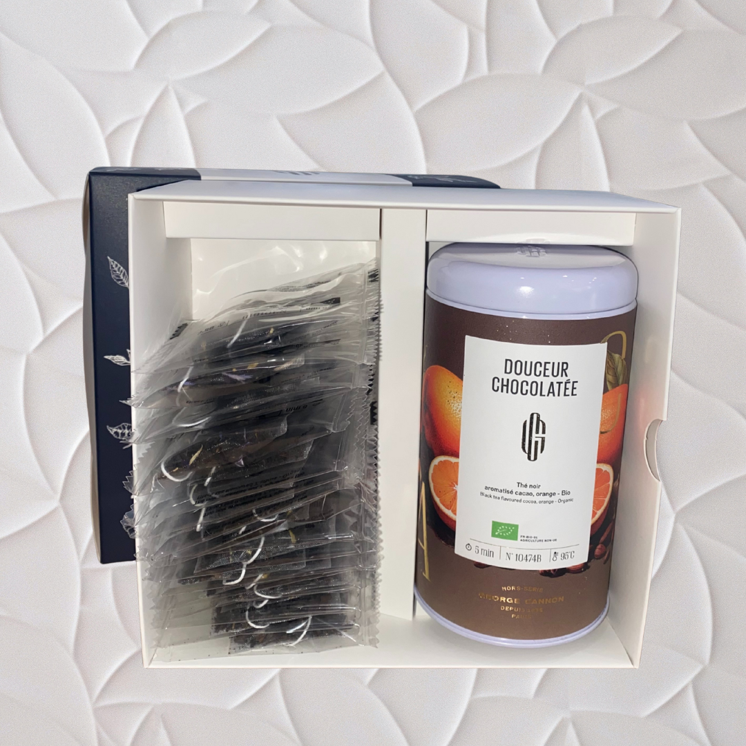 Douceur Chocolatée – thé noir cacao & orange : une tasse ronde et gourmande, aux notes chocolatées relevées d’un zeste d’agrume.