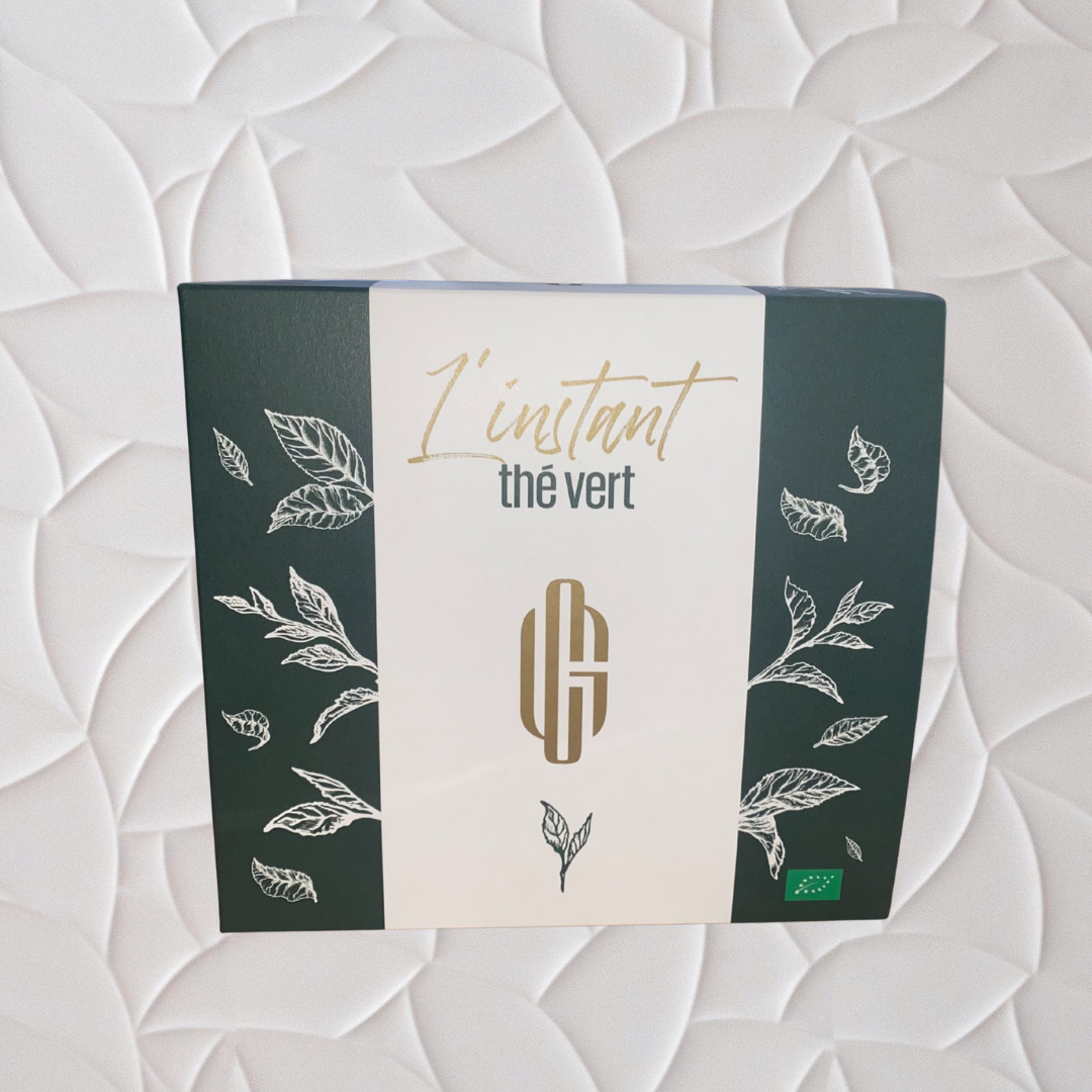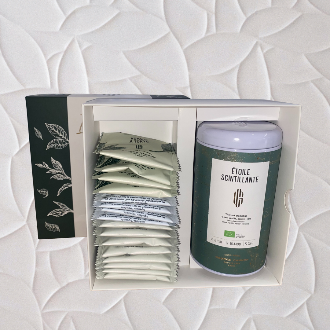 Coffret découverte L’Instant Thé Vert, un voyage aromatique tout en finesse. A l’intérieur vous trouverez une boîte de 100g de vrac ainsi que 16 sachets de thés verts :