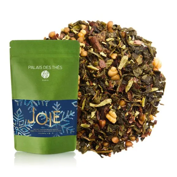 Cette année Palais des Thés offre un thé de Noël Bio nommé Joie. Ce thé vert, est composé de sarrasin grillé, d’amande, et de coques de cacao. Cette création hivernale éveille les sens comme une caresse de chaleur dans l’air frais. À chaque gorgée, se mêlent la douceur ronde et réconfortante de l’amande, la note torréfiée du sarrasin, tandis que les coques de cacao dévoilent une douceur subtilement chocolatée. Un accord qui évoque le frisson délicieux des premiers flocons d’hiver. Cette recette bio est pensée pour réchauffer le cœur et éveiller les sens.