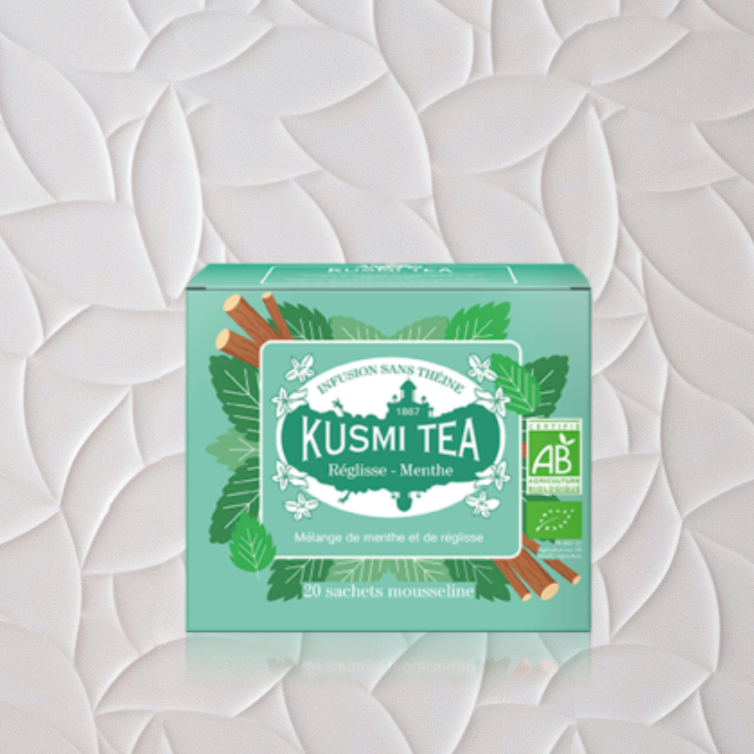Reglisse menthe Bio de Kusmi Tea est une infusion uniquement composée de plantes, à la fois fraîches et douces. Elle apporte des notes mentholées boisées et sucrée. Sans théine, elle peut être consommée tout au long de la journée.